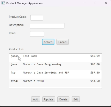 This JavaFX program provides a GUI for managing products (code, description, price) backed by a SQLite database. Features: